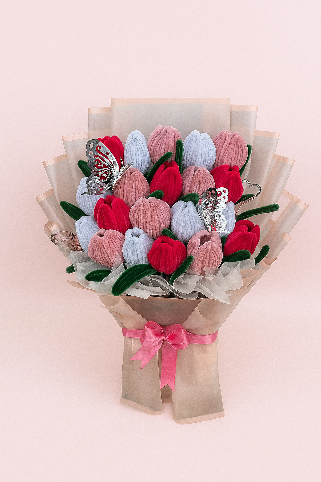 Bouquet de 20 tulipanes eternos con diseño elegante, incluye mariposas 3D plateadas, tarjeta dedicatoria.